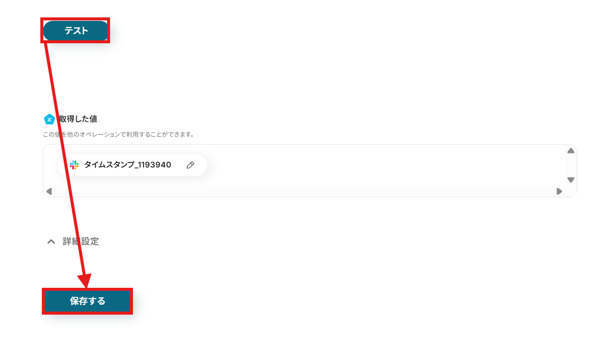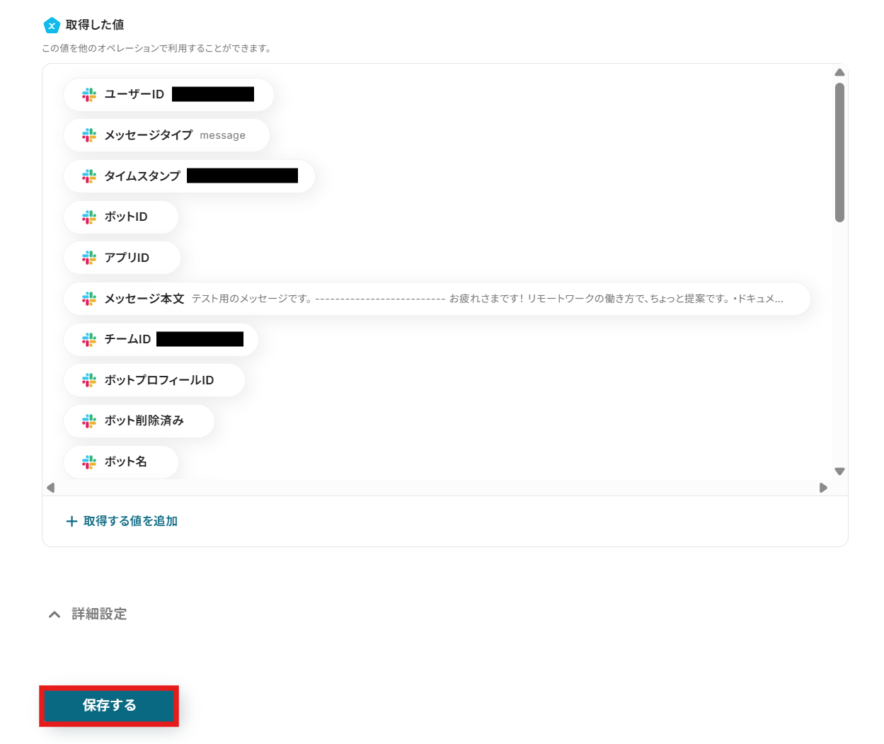テストが成功すると、成功を示す画面が表示され、Slackから取得した情報を引用できるようになります。
