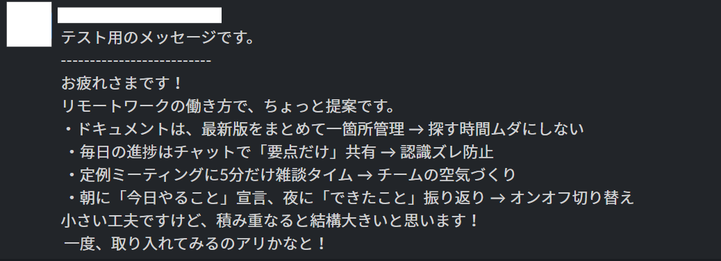 なお、今回はテストとして以下のようなメッセージを送信しています。