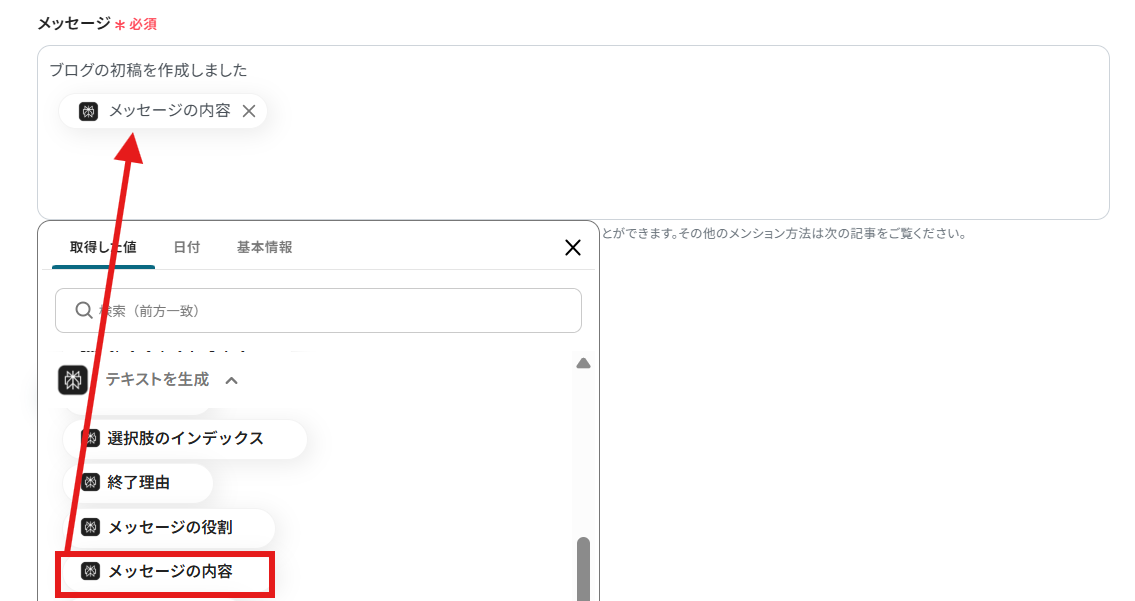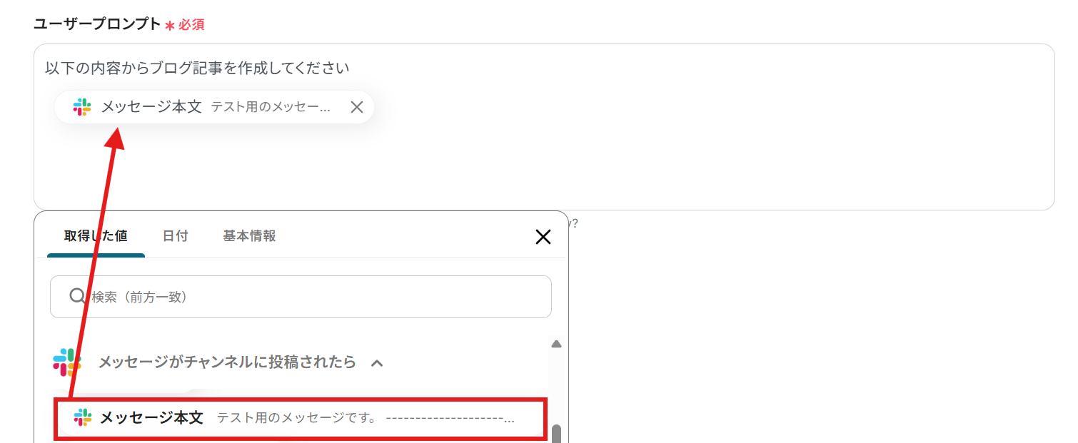 ユーザープロンプト:元から設定されています。編集欄をクリックすると、Slackで取得した情報を引用できます。