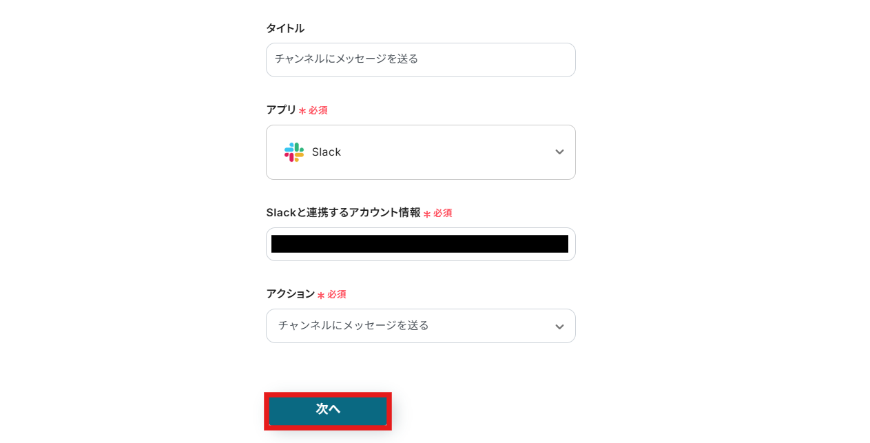 アクションやタイトルなどはこれまで同様に設定し、「次へ」をクリックします。