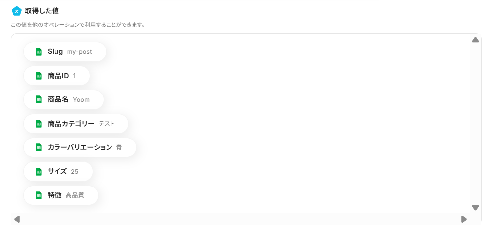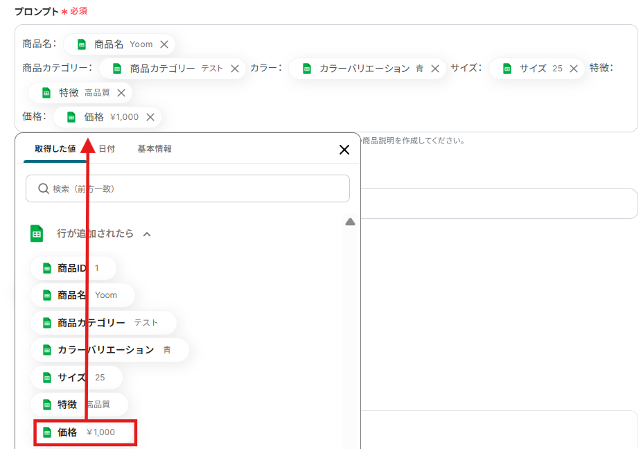続いて、Google スプレッドシートのアウトプットから以下のように選択してください。これで商品に関する詳細情報をプロンプトに組み込むことができます。