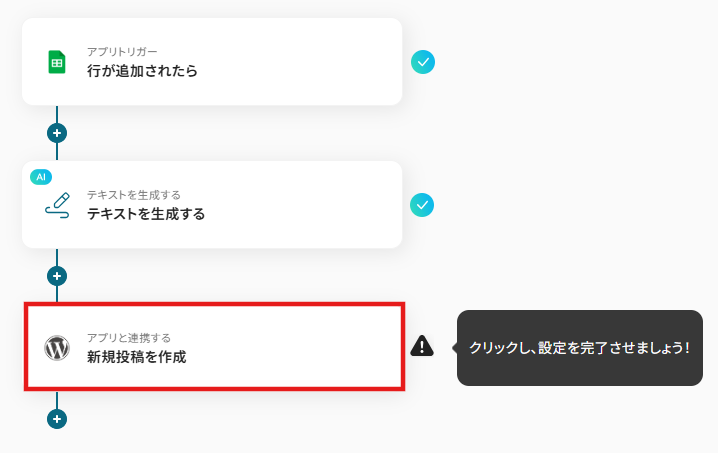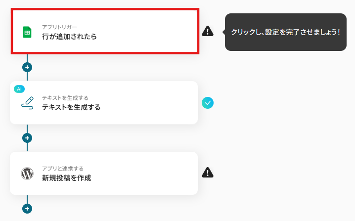 それではここから代表的な例として、Google スプレッドシートに行が追加された際に、AIがブログ投稿の内容を作成し、それをWordPressに下書きとして自動保存するフローの設定方法を解説します!