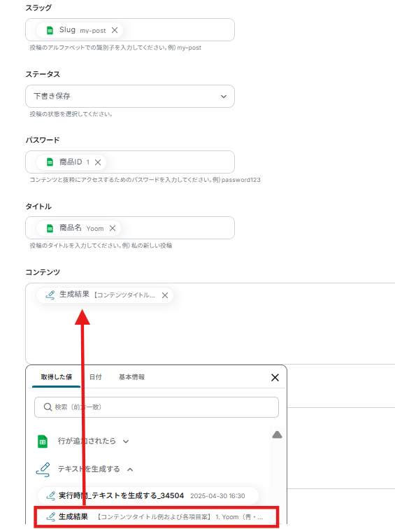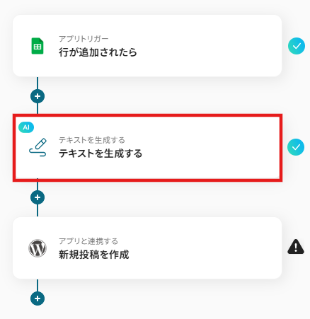 「Google スプレッドシートに行が追加されたら、AIで投稿内容を作成しWordPressに下書き保存する」フローは、ブログコンテンツの自動化を実現する業務ワークフローです。