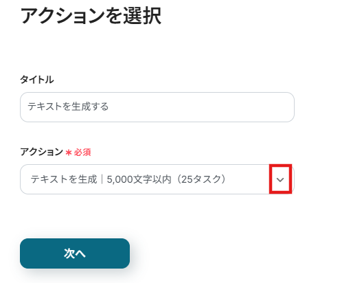先ほどと同様にタイトルや連携するアカウント情報を任意で設定し、アクションはテンプレート通りに「新規投稿を作成」のまま「次へ」をクリックして進んでください。