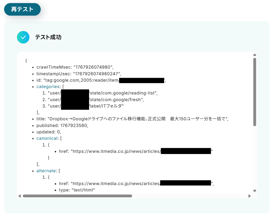 取得した値について、詳しくは「取得した値」のテスト値について をご参照ください。なお、ここで取得した値はこの後の設定で活用していきます。