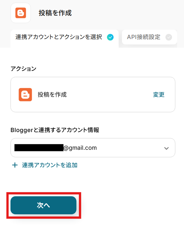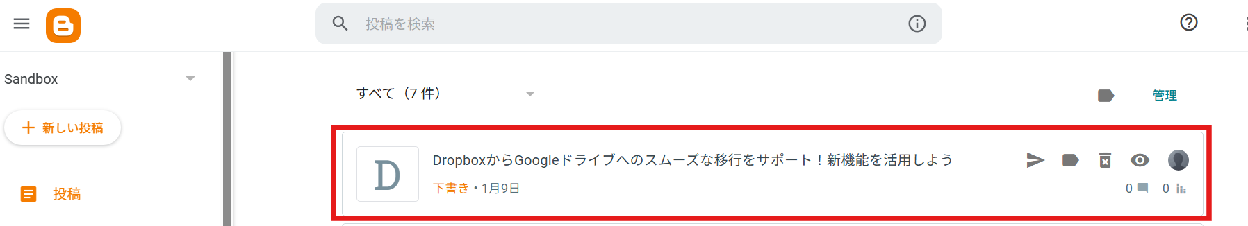 ステップ6:Bloggerで投稿を作成する 続いて、Bloggerに投稿を作成する設定を行います。 以下の赤枠をクリックしましょう。