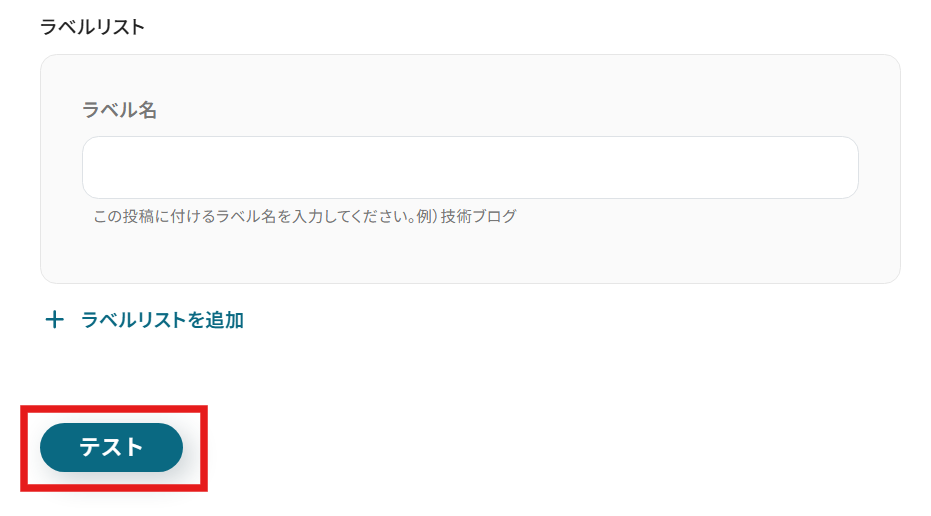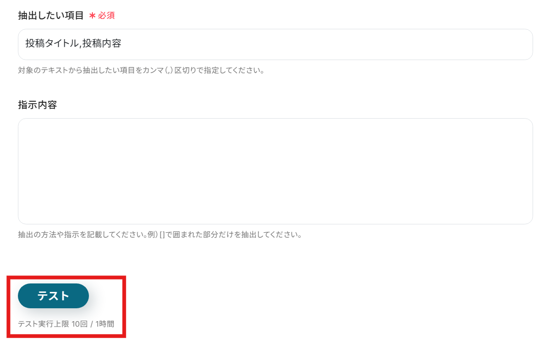 抽出したい項目には、今回「投稿タイトル」と「投稿内容」を指定しました。どのような記事を作成したいのかによりカスタマイズが可能です。 ここまで設定が完了したら、テキストを抽出できるかテストを行います。テストボタンをクリックしましょう。