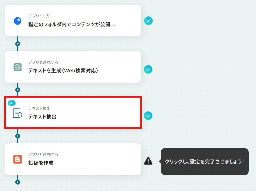 ステップ5:テキストを抽出する 続いて、生成したコンテンツデータから、Bloggerの記事作成時に使用する「タイトル」などを抽出する設定を行います。 以下の赤枠をクリックしましょう。