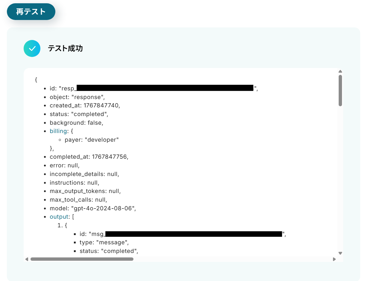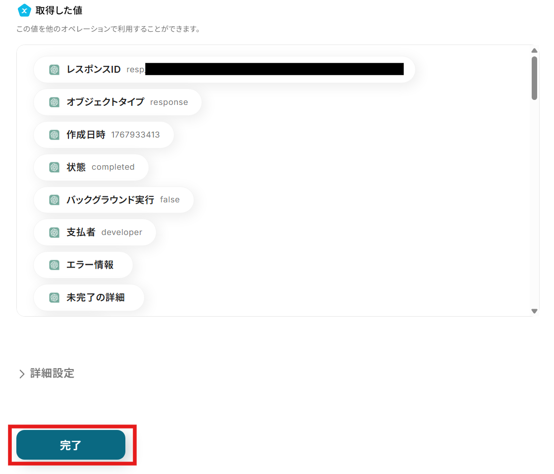 テストが成功すると、テスト成功画面と取得した値が表示され、ChatGPTが生成したコンテンツが確認できます。求めているコンテンツが生成できているか確認し、問題がなければ「完了」をクリックしましょう。