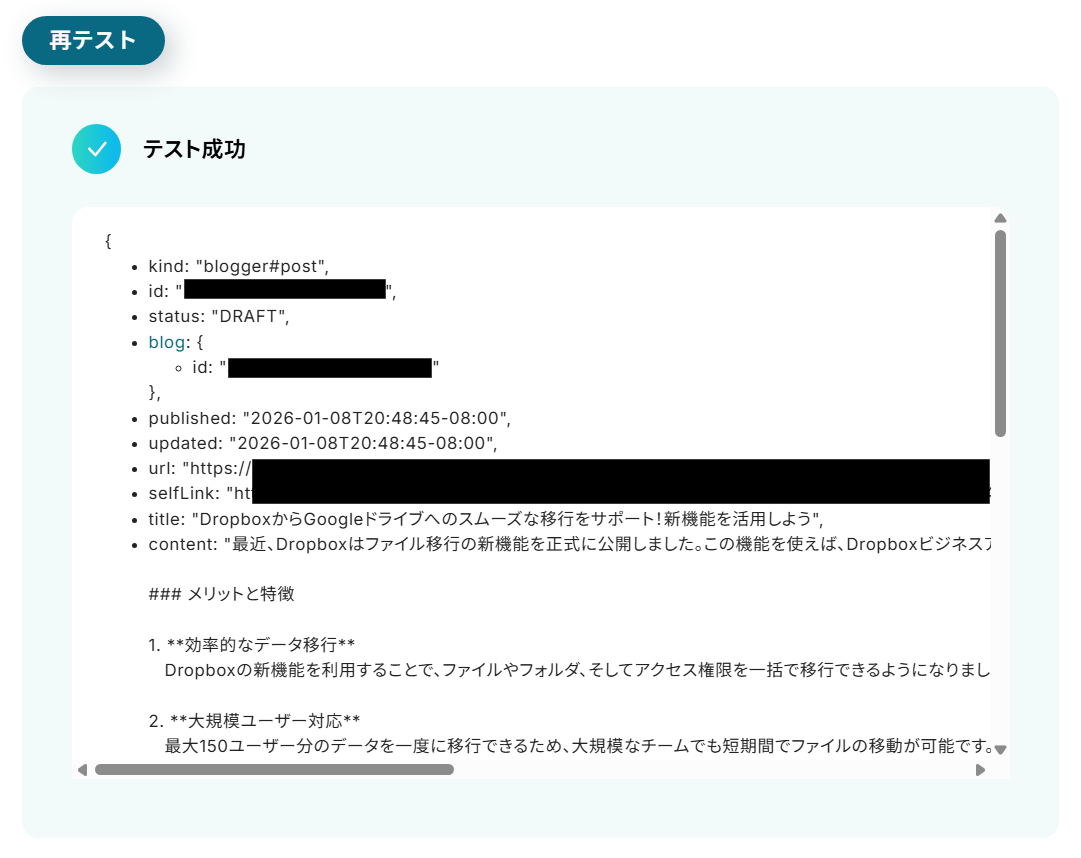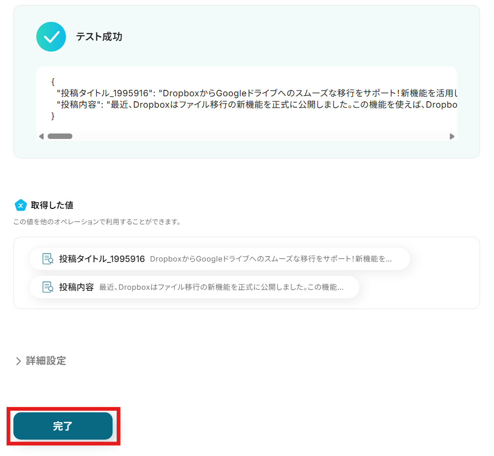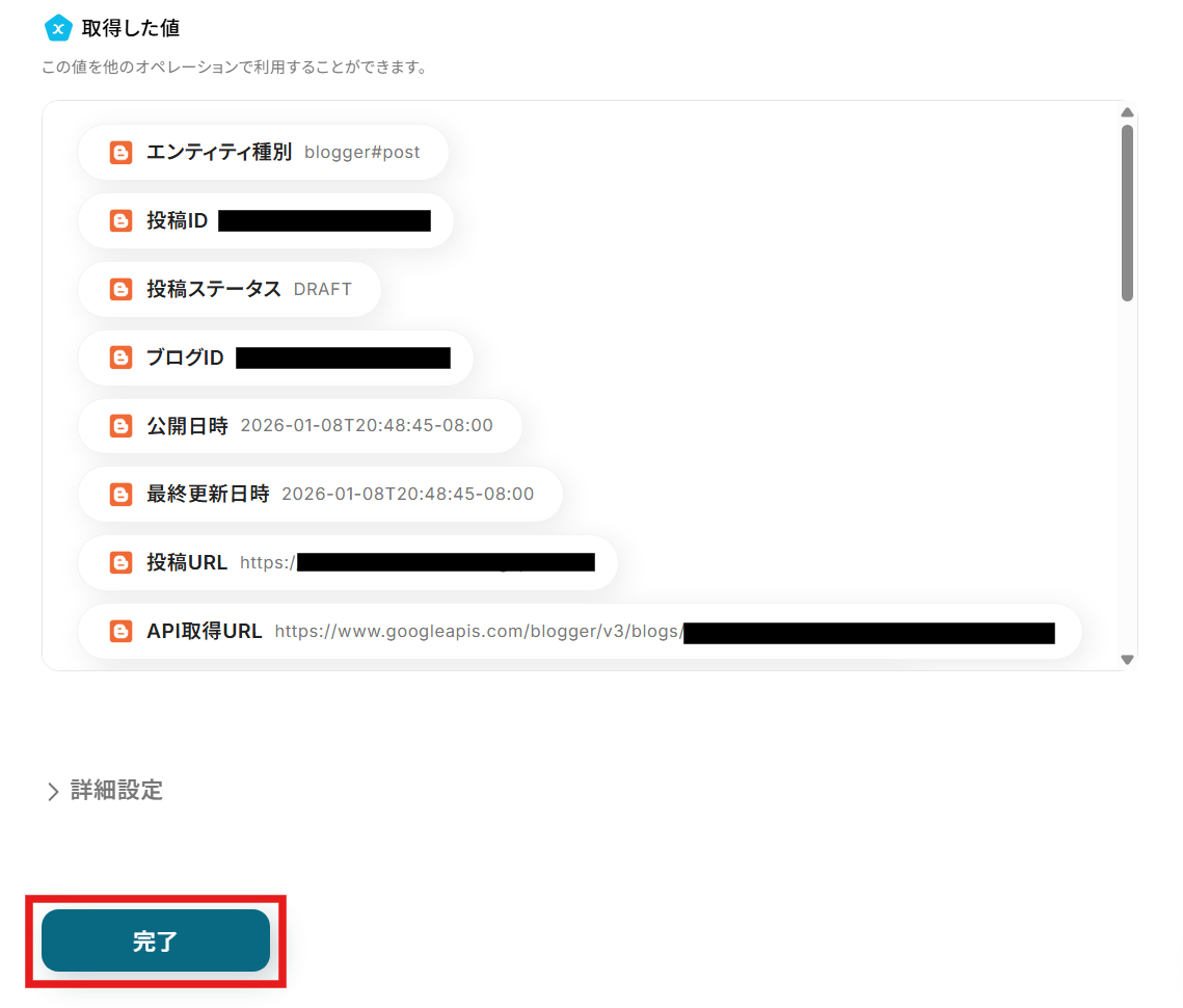 テストが成功すると、テスト成功画面と取得した値が表示され、作成されたブログデータが確認できます。 確認し、問題がなければ完了するをクリックしてください。