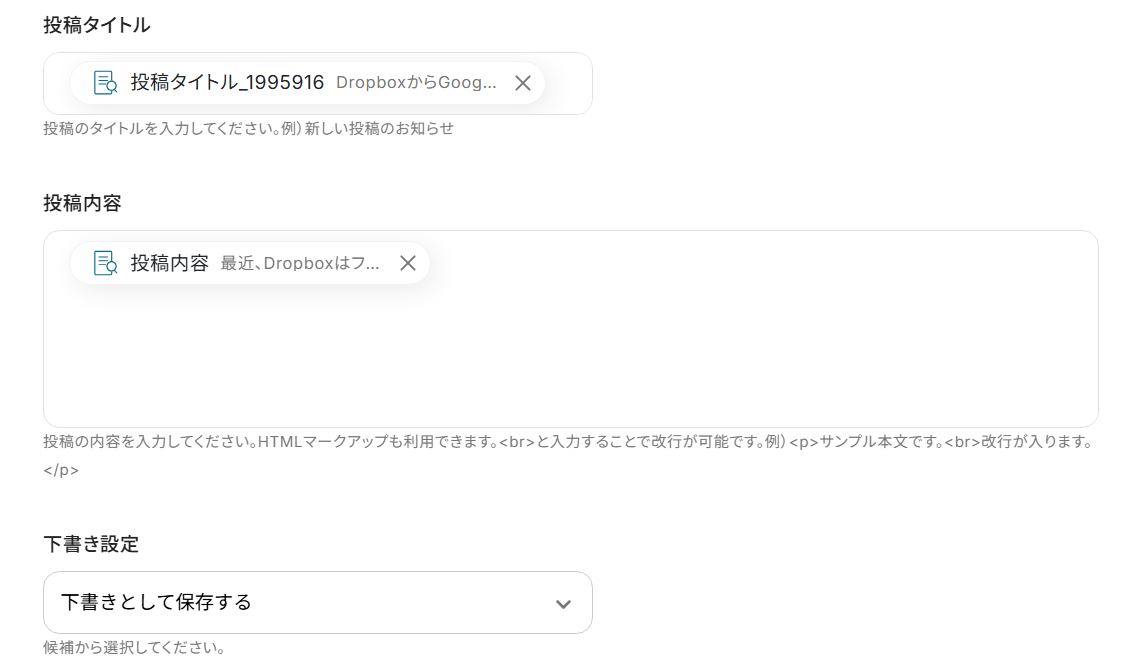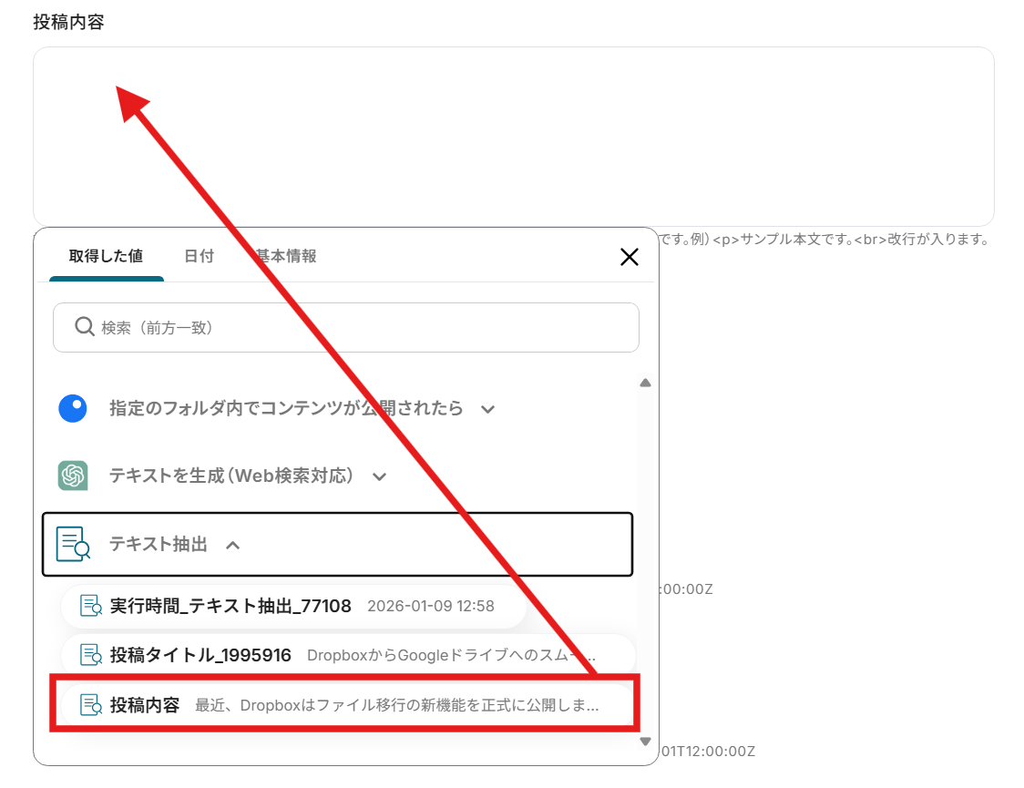 次に以下の項目を埋めていきますが、必須以外はどの項目を埋めるのか任意で調整が可能です。 そのため、記事作成にあたり指定したい箇所がある部分のみ設定していきましょう。 なお、ここでも取得した値を活用可能です。 例として「投稿内容」に取得した値を挿入してみます。「テキスト抽出」から「投稿内容」を選択してください。