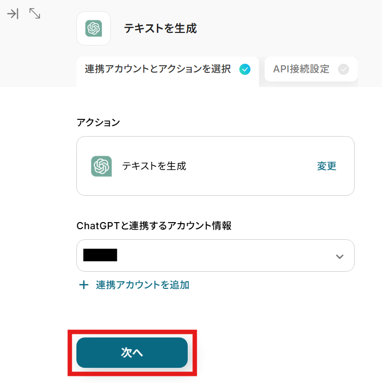 ChatGPTと連携するアカウント情報はマイアプリ連携時に設定したアカウント名を選択してください。 ここまで設定ができたら次へをクリックします。