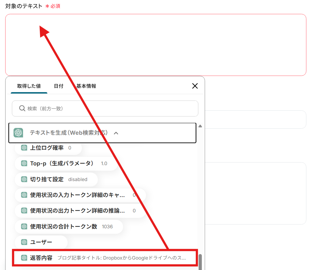 対象のテキストには1つ前の項目で取得した値である「返答内容」を活用します。