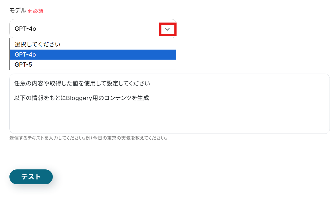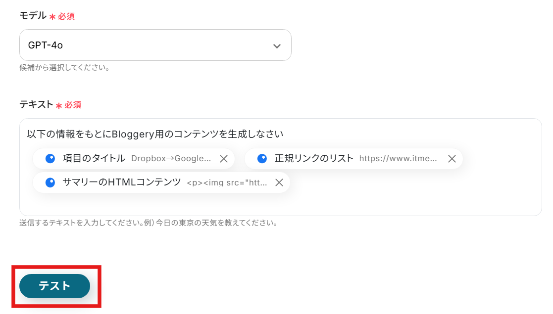 プロンプトに応じて必要な取得した値を挿入したら、求めるコンテンツが生成されるかテストを行います。テストボタンをクリックしましょう。