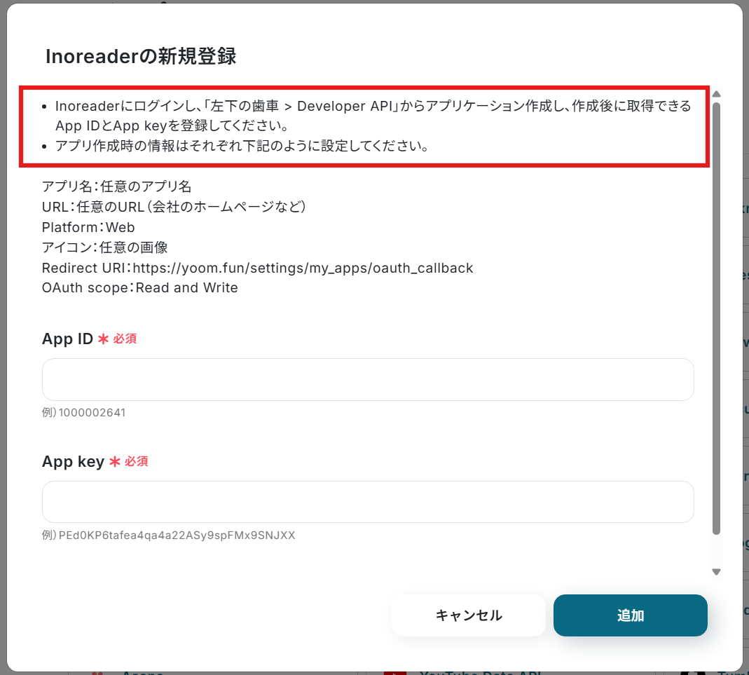 ステップ1:Inoreader・ChatGPT・Bloggerのマイアプリ連携 ここでは、Yoomとそれぞれのアプリを連携して操作が行えるようにしていきます。詳しい手順は以下のナビをご確認ください。