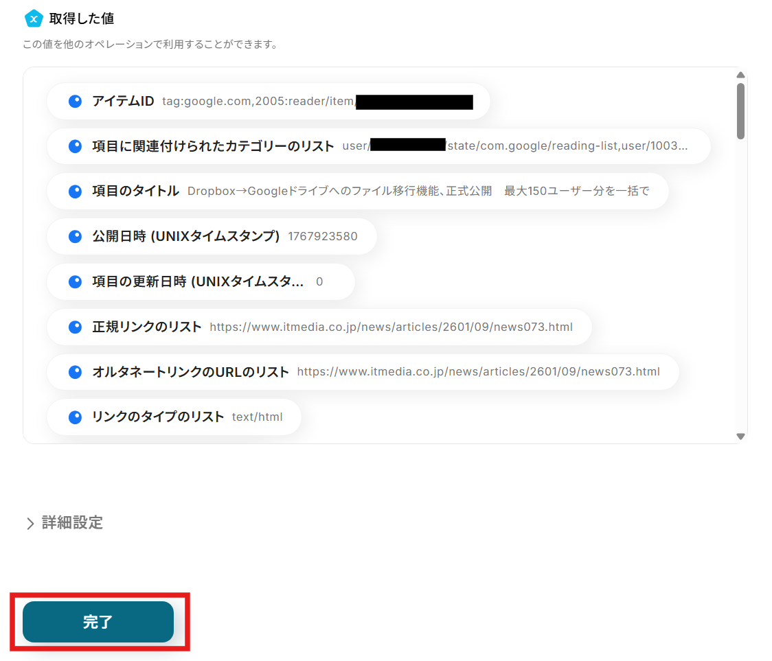 テストが成功するとテスト成功画面と取得した値が表示され、指定のフォルダコンテンツが確認できます。「完了」をクリックして設定完了です!