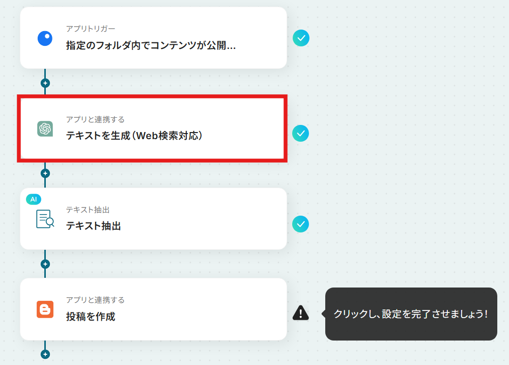アクションが「テキストを生成(Web検索対応)」になっていることを確認しましょう。