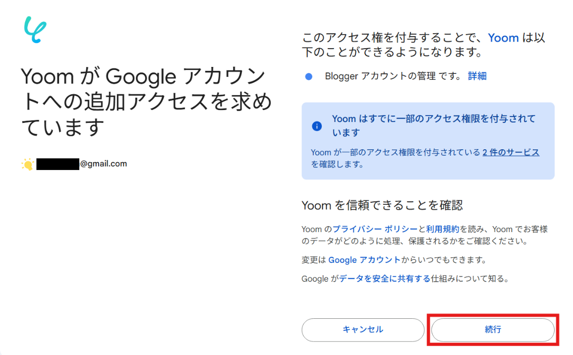 利用規約などに同意ができたら「続行」を選択してください。