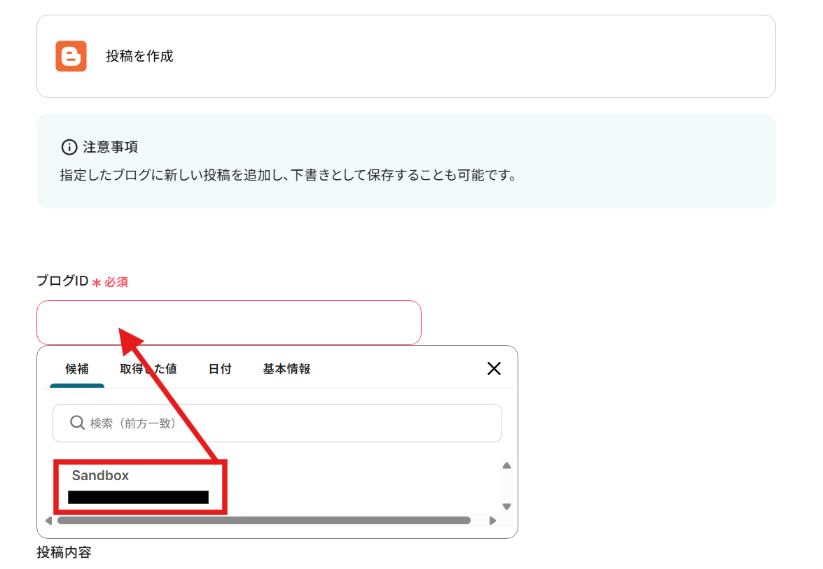 まずは必須項目の「ブログID」を設定します。ボックスをクリックすることで指定可能です。