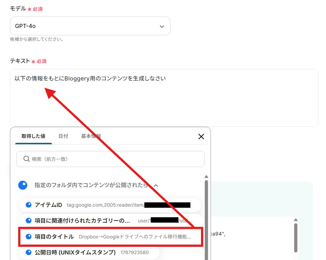 次に、トリガー設定時に取得した値=Inoreaderの指定フォルダから取得した投稿データを用いてプロンプトを指定していきましょう。今回は例として以下のようなプロンプトを指定しました。この他、先ほど取得した値を挿入し、より詳細なプロンプトに仕上げていきましょう。 「メッセージ内容」のボックスをクリックし、「指定のフォルダ内でコンテンツが公開されたら」のプルダウンから、タイトルに該当する「項目のタイトル」を選択してください。