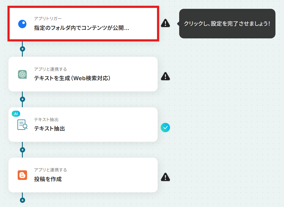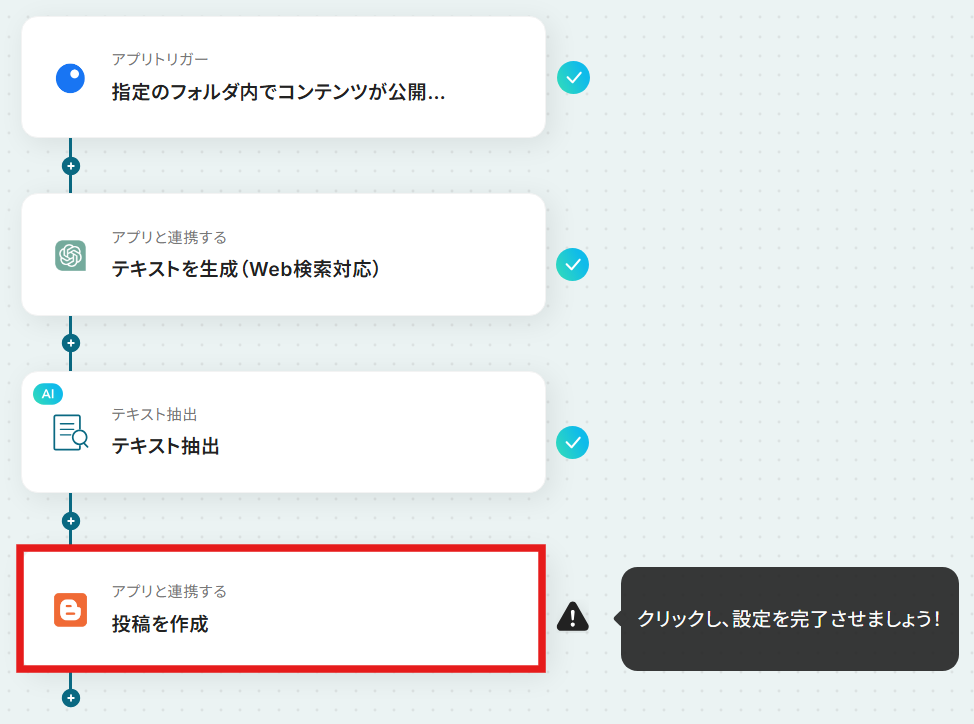 Inoreaderのトリガー設定では、監視対象としたいフォルダを任意で指定してください。 ChatGPTでテキストを生成する際に、生成したいコンテンツの内容に合わせてプロンプト(指示文章)を任意で設定してください。 AI機能のテキスト抽出では、ChatGPTが生成したテキストから、Bloggerへの投稿に必要なタイトルや本文などの項目を任意で設定してください。 Bloggerで投稿を作成するアクションを設定する際に、投稿先となるブログのIDを任意で設定してください。 ■注意事項