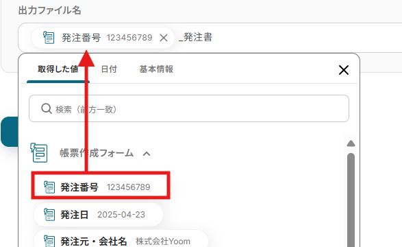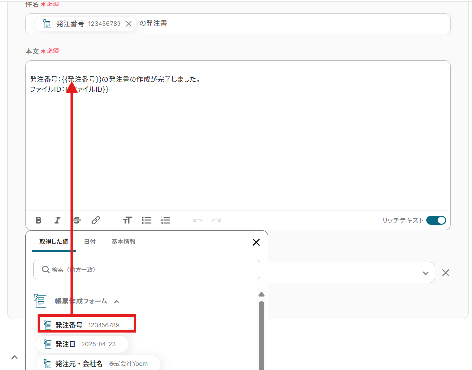 件名や本文には帳票作成フォームで取得したアウトプットを活用できます。