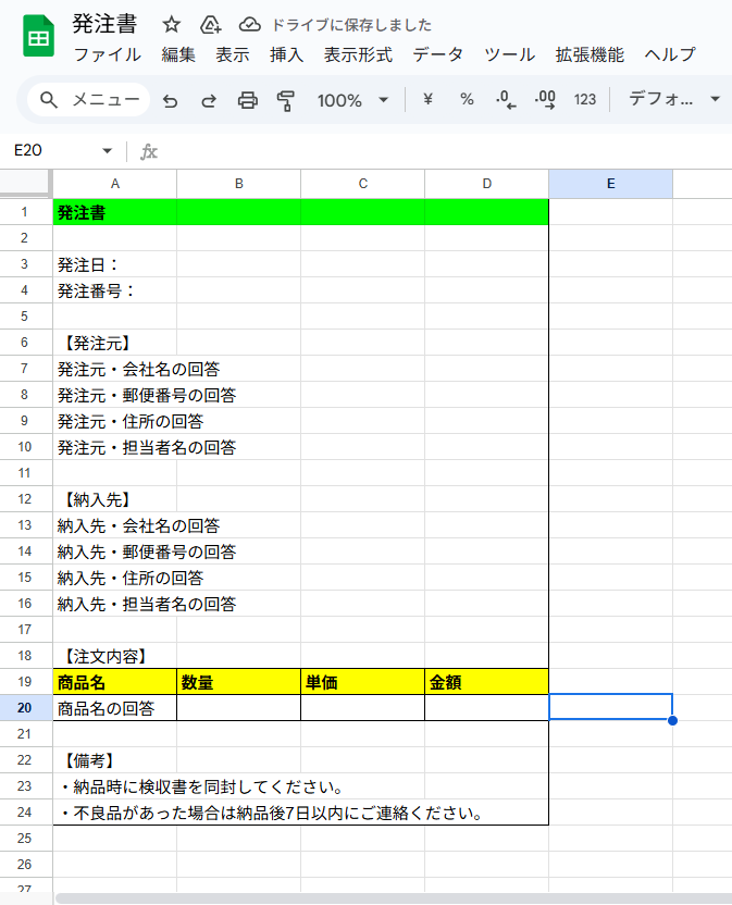 ・こちらのようなスプレッドシートで作成した請求書の雛形を用意してください。