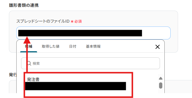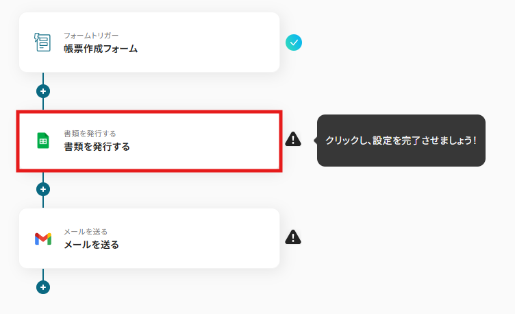 - 次に、Google スプレッドシートの「書類を発行する」アクションで、フォーム情報を基に請求書を作成します。