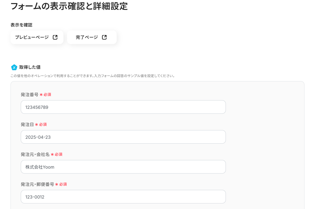 - フォームトリガーでは、請求書取得に必要なサービス名、ID、パスワード、対象年月など、管理しやすいように入力項目を任意で設定してください。