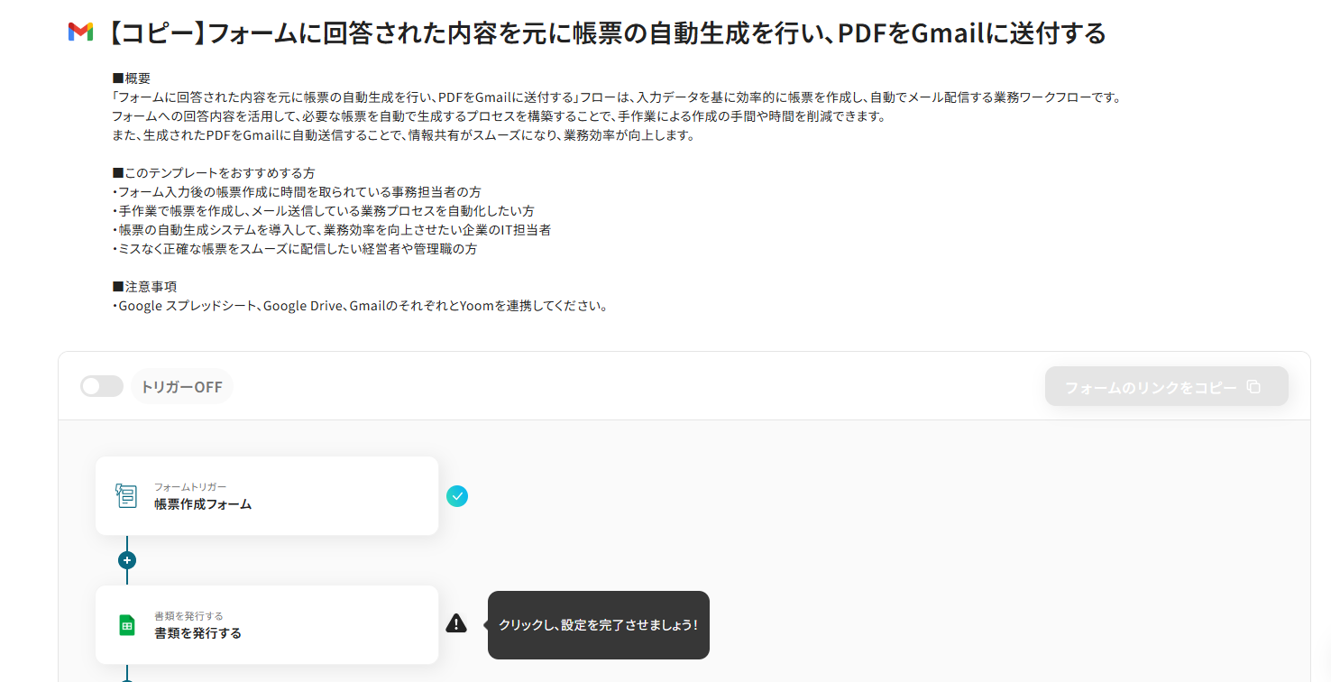 それではここから代表的な例として、Yoomのフォームに回答が送信された際に、その内容をもとに帳票PDFを自動で生成し、指定した宛先にGmailで自動送信するフローを解説していきます!