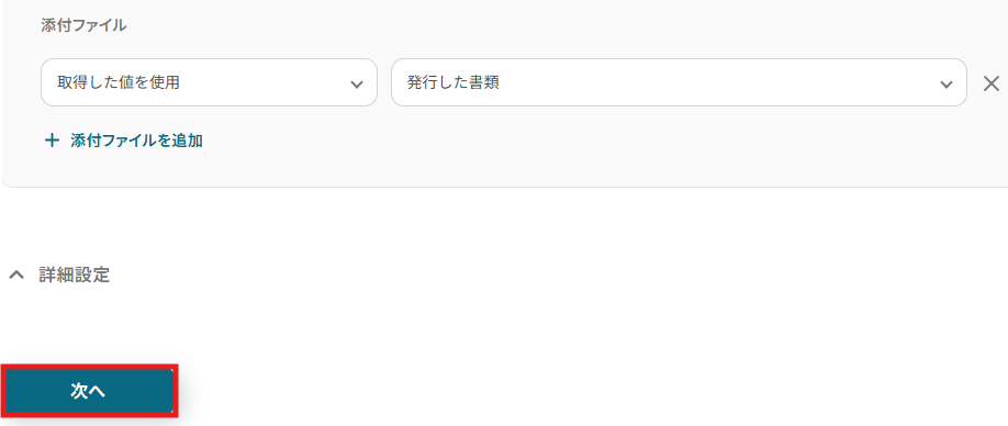 - 最後に、オペレーションでメール機能を選択し、発行した見積書を添付して顧客に送付するアクションを設定します。