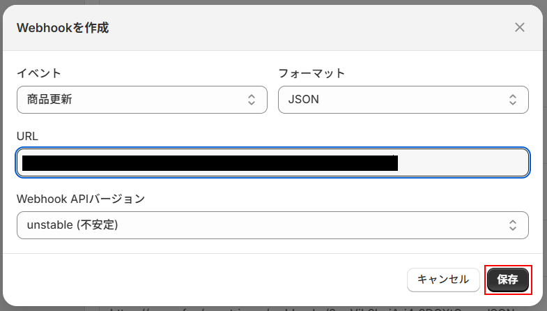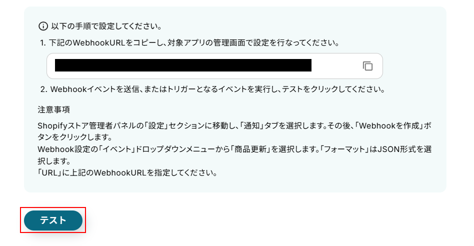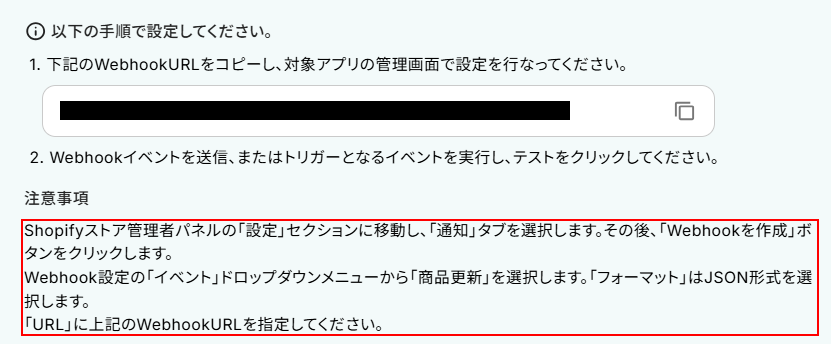 Webhookの設定を行います。 URLをコピーしたら、下記の注意事項を確認しShopifyの管理画面に移動してWebhookの設定を行ってください。