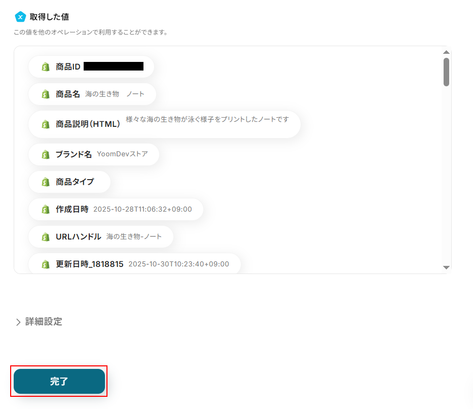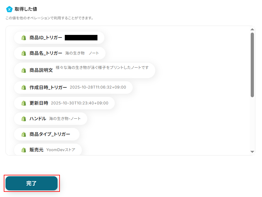 テストに成功するとテスト成功画面が表示され、取得した値が表示されます。 取得した値は実行した結果が設定される動的な値として利用できるため、このあとの設定でも使用します。 確認できたら忘れずに完了 をクリックしましょう。