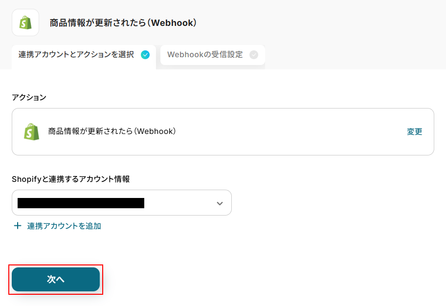 Shopifyの商品情報が更新されたら(Webhook) をクリックします。
