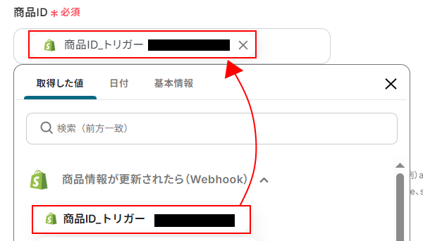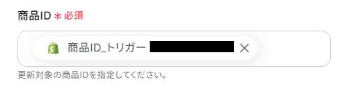 商品IDを設定します。 商品IDにはデフォルトで、取得した値の商品ID_トリガー が設定されています。 取得した値を活用することで、固定値ではなくトリガーが実行されるたびに最新の情報が反映できます。