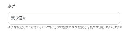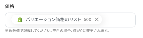 タグを設定します。 タグとして使用したい文字を直接入力するか、入力欄をクリックし表示された取得した値の中から設定します。 直接入力した場合は固定値となり、このテンプレートを通して更新する全ての商品情報に反映されますのでご注意ください。 また、Shopifyに存在しないタグ名を入力した場合はタグが新規作成されます。