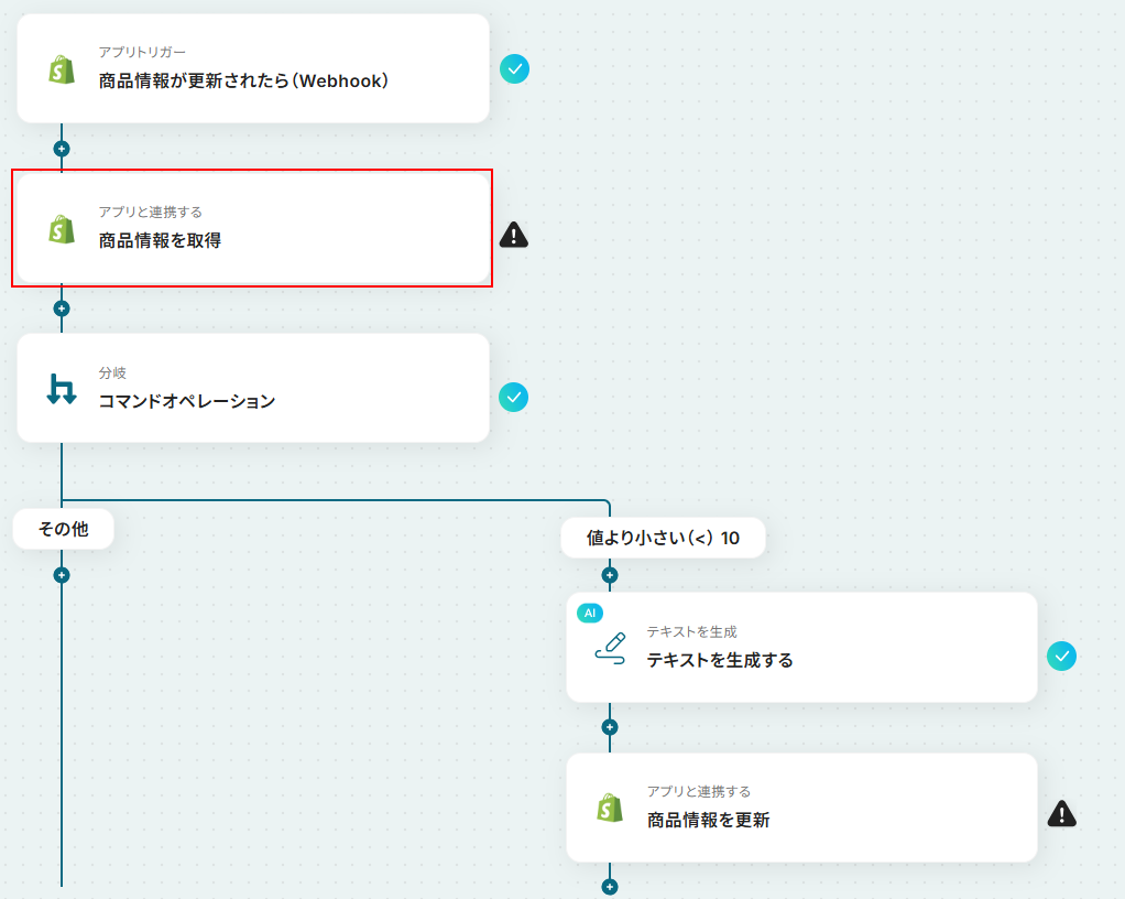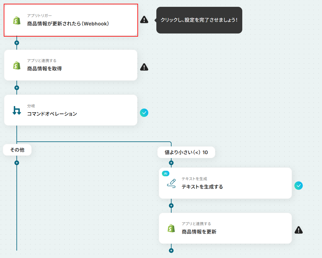 ■概要 ECサイトの運営において、商品の在庫数が少なくなった際に手動で商品説明文を更新したり、タグを付け替えたりする作業は手間がかかるのではないでしょうか。 このワークフローは、Shopifyで管理する商品の在庫数が設定した閾値を下回った際に、AIが在庫警告文などのテキストを自動生成し、商品説明や商品タグを自動で更新します。 ECサイトにおけるテキスト更新作業を効率化し、販売機会を逃さないタイムリーな情報発信を実現します。 ■このテンプレートをおすすめする方 ・Shopifyを利用してECサイトを運営しており、在庫に応じた商品説明の更新に手間を感じている方 ・ECサイトの商品説明やキャッチコピーなどのテキストをAIで自動生成し、運用を効率化したい方 ・手作業による更新漏れや設定ミスを防ぎ、正確で迅速な在庫情報の反映を目指している方 ■注意事項 ・ShopifyとYoomを連携してください。 ・Shopifyはチームプラン・サクセスプランでのみご利用いただけるアプリとなっております。フリープラン・ミニプランの場合は設定しているフローボットのオペレーションやデータコネクトはエラーとなりますので、ご注意ください。 ・チームプランやサクセスプランなどの有料プランは、2週間の無料トライアルを行うことが可能です。無料トライアル中には制限対象のアプリを使用することができます。 ・分岐はミニプラン以上のプランでご利用いただける機能(オペレーション)となっております。フリープランの場合は設定しているフローボットのオペレーションはエラーとなりますので、ご注意ください。 ・ミニプランなどの有料プランは、2週間の無料トライアルを行うことが可能です。無料トライアル中には制限対象のアプリや機能(オペレーション)を使用することができます。