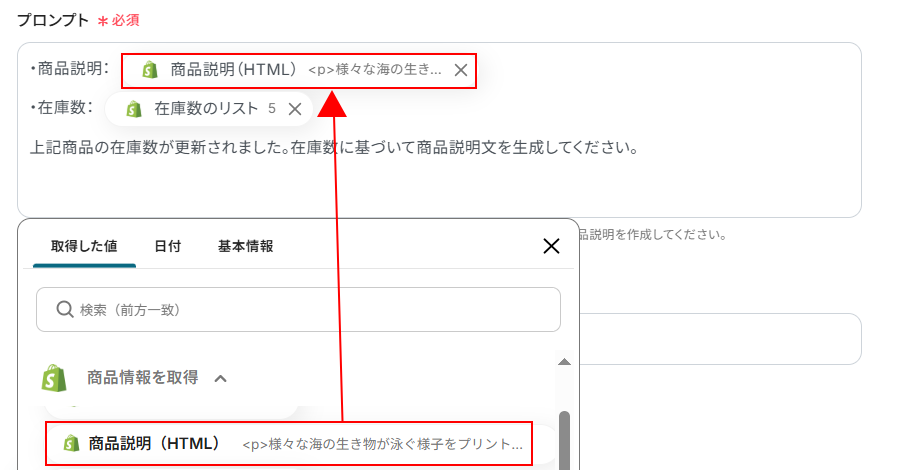 プロンプトを設定します。 プロンプトはデフォルトで設定されていますが、自由に編集可能です。 以下のように入力欄をクリックすることで取得した値を追加することもできます。 直接入力した場合は、入力した値が固定値となりこのテンプレートを通して設定する全てのプロンプトに反映されますのでご注意ください。