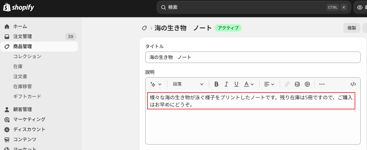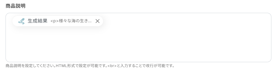 商品説明を設定します。 商品説明にもデフォルトで取得した値が設定されていますのでご確認ください。