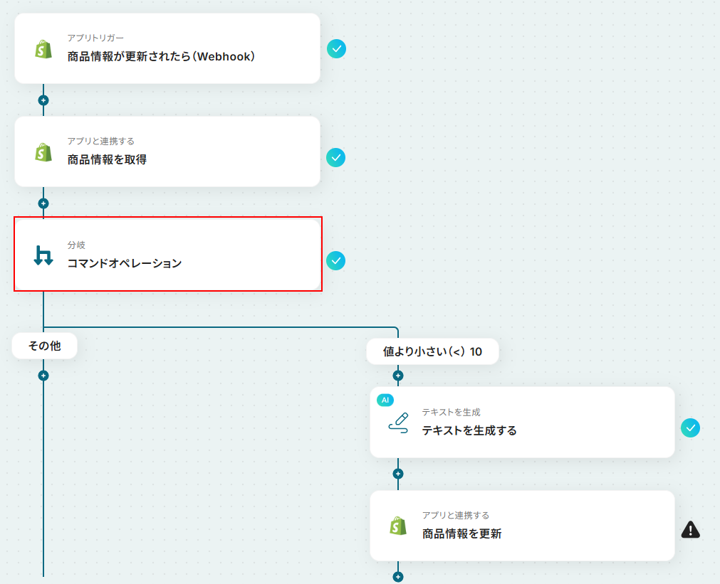 分岐の条件を設定しましょう。 オペレーション、取得した値、分岐条件はデフォルトで設定されています。 また、取得した値の項目に設定されている在庫数のリストには、商品の在庫数が設定されています。 分岐条件で値より小さい 、10 が設定されているように、在庫数が10を下回った場合に処理を行うようにデフォルトで設定されている状態です。 ※分岐条件を10から変更したい場合は、右端にある10と入力されている項目に設定したい数を入力してください。