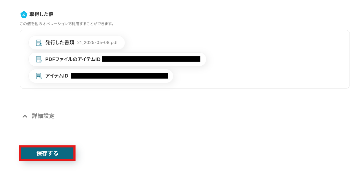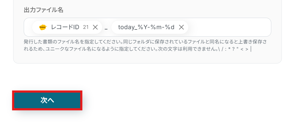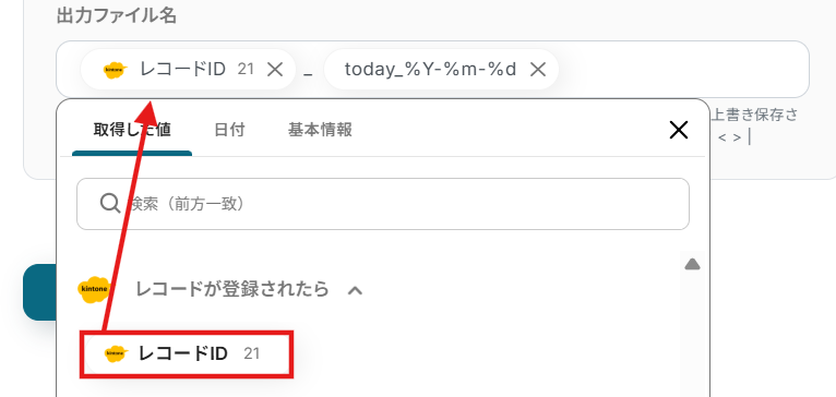 出力ファイル名:元から設定されています。入力欄をクリックするとkintoneで取得した値を引用できます。今回はデフォルトのままにしておきます。