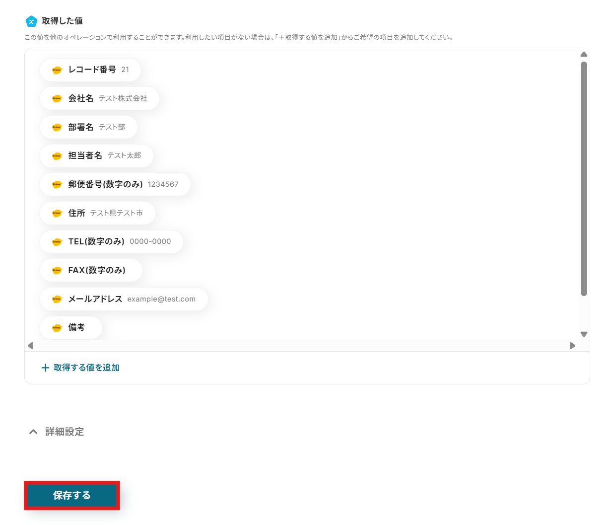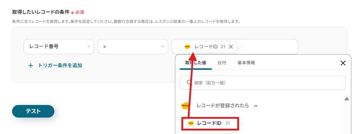 テストが成功すると「テスト成功」の画面が表示され、kintoneから取得した情報を引用できるようになります。