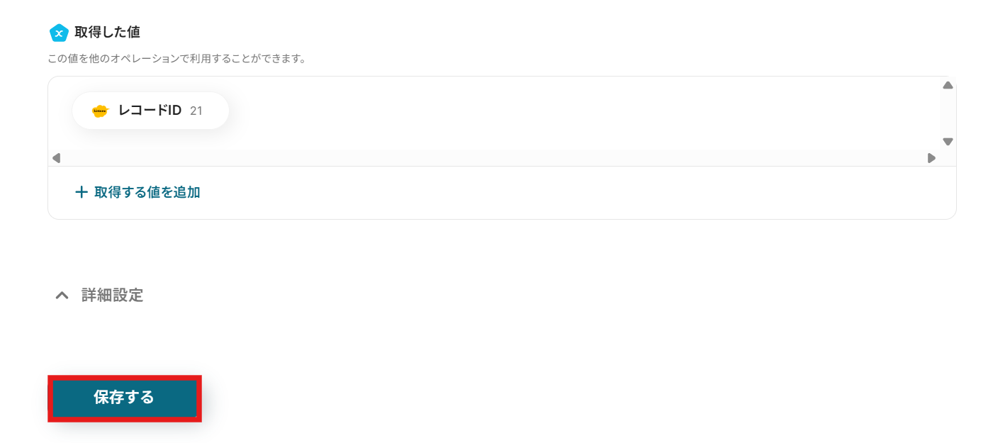 さっき「レコードが登録されたら」で取ってきた情報がそのまま引用できます。