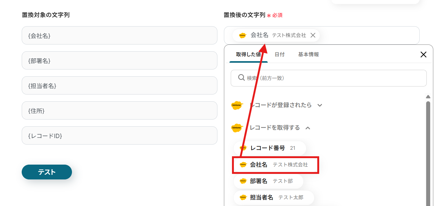 置換後の文字列は入力欄をクリックして、「レコードを取得する」の欄から引用していきます。