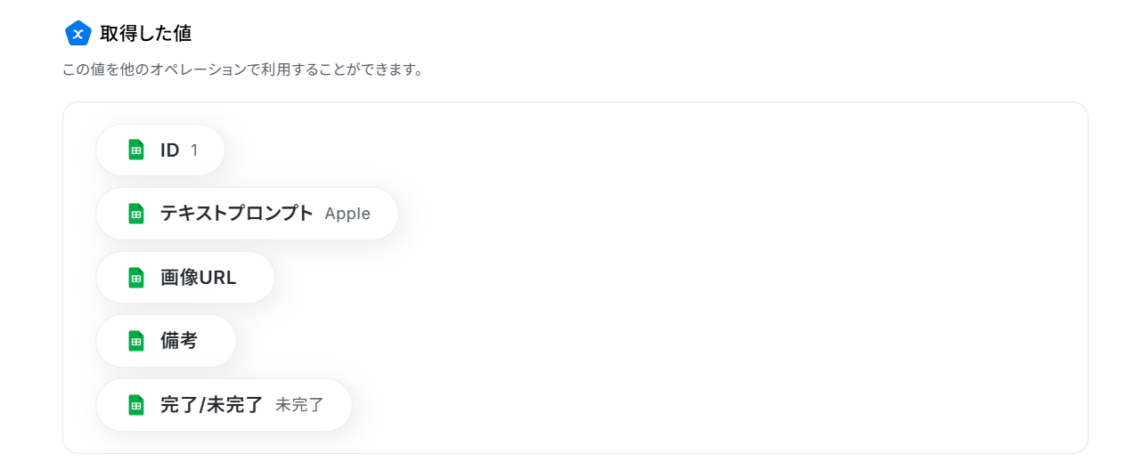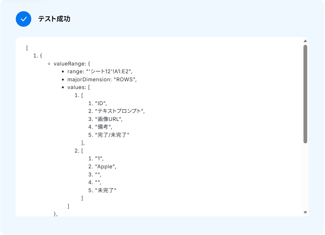 テストに成功すると、取得した値にGoogle スプレッドシートの情報が反映されます。