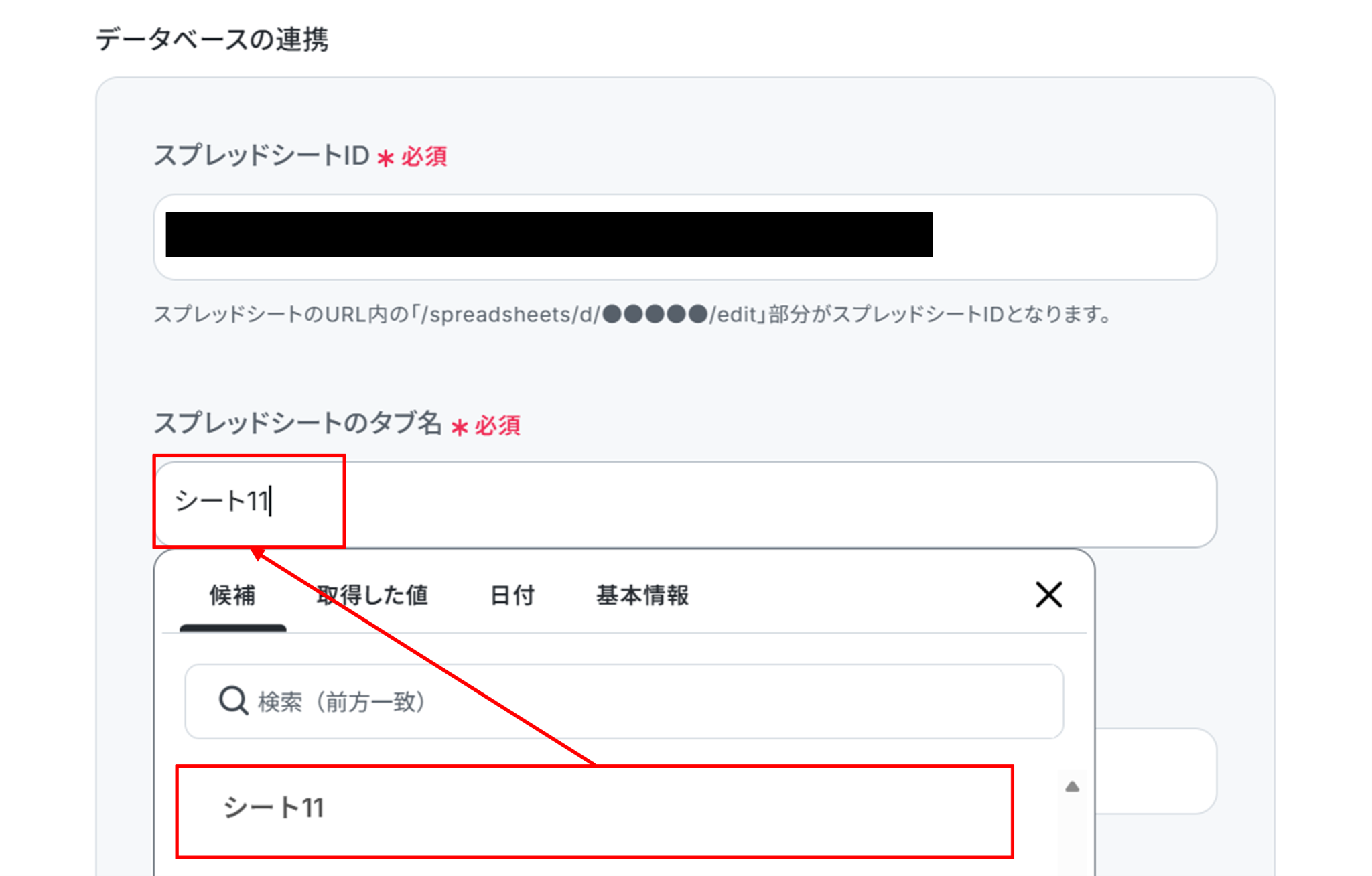 「スプレッドシートID」と「スプレッドシートのタブ名」を候補から選択します。