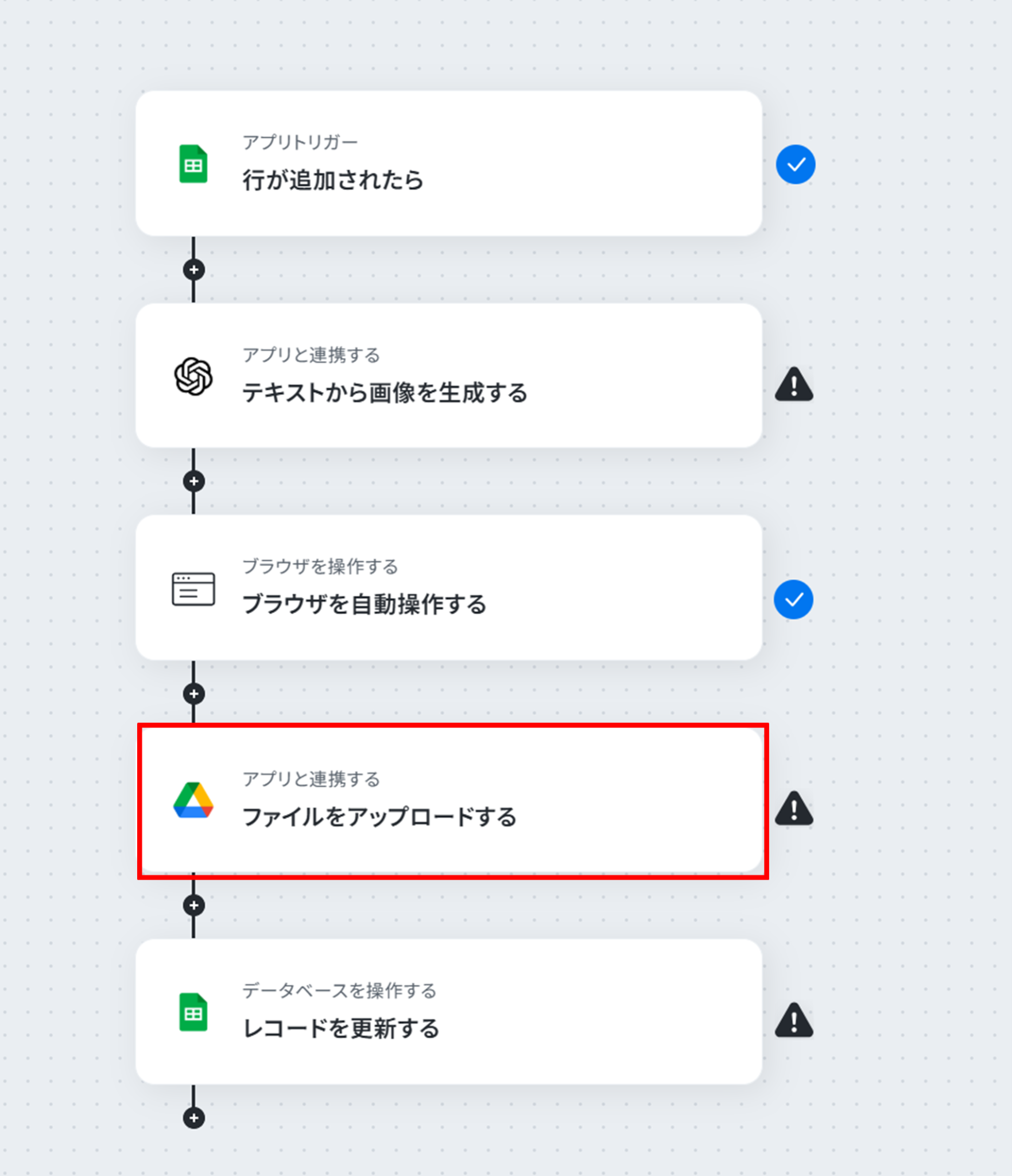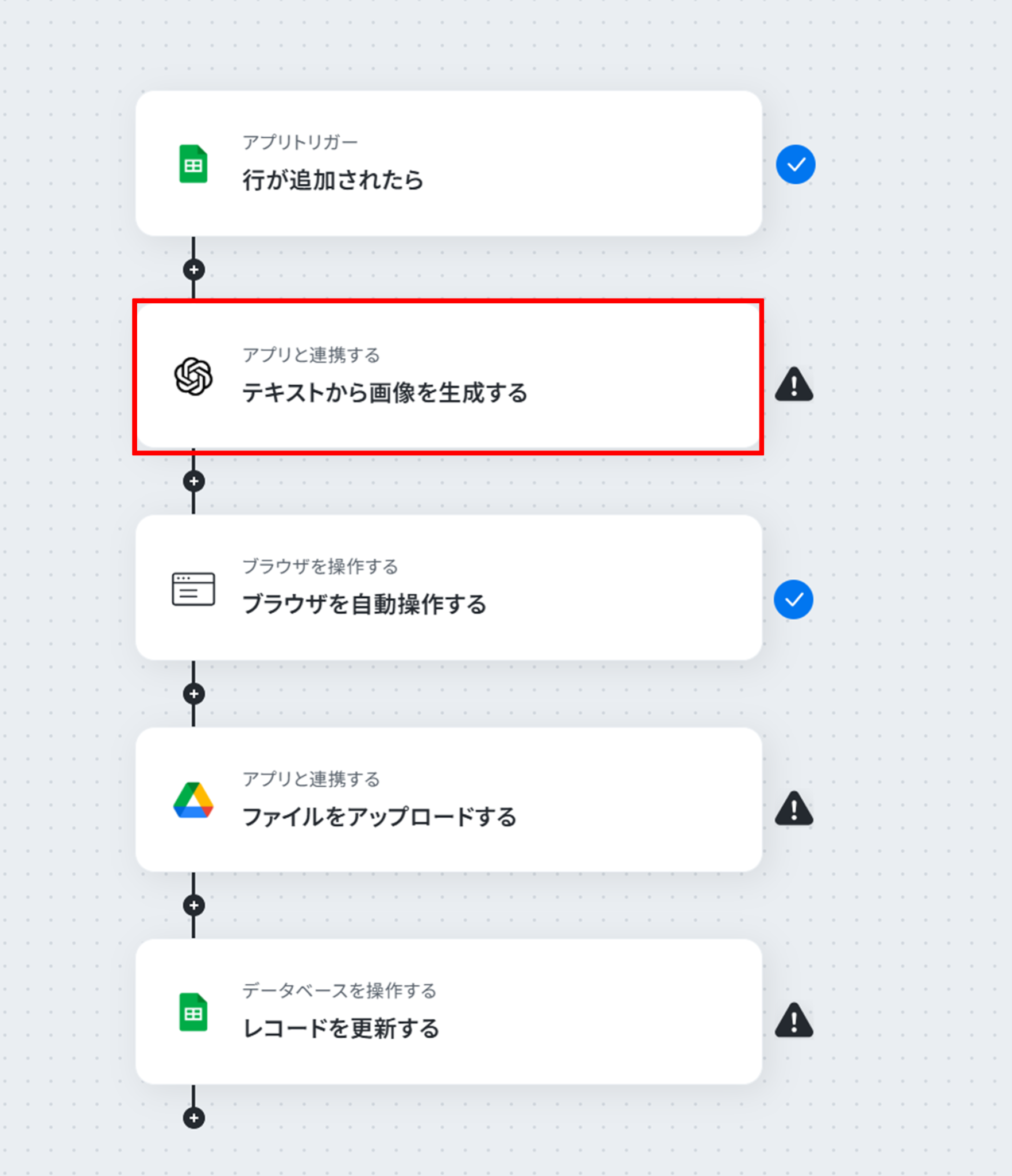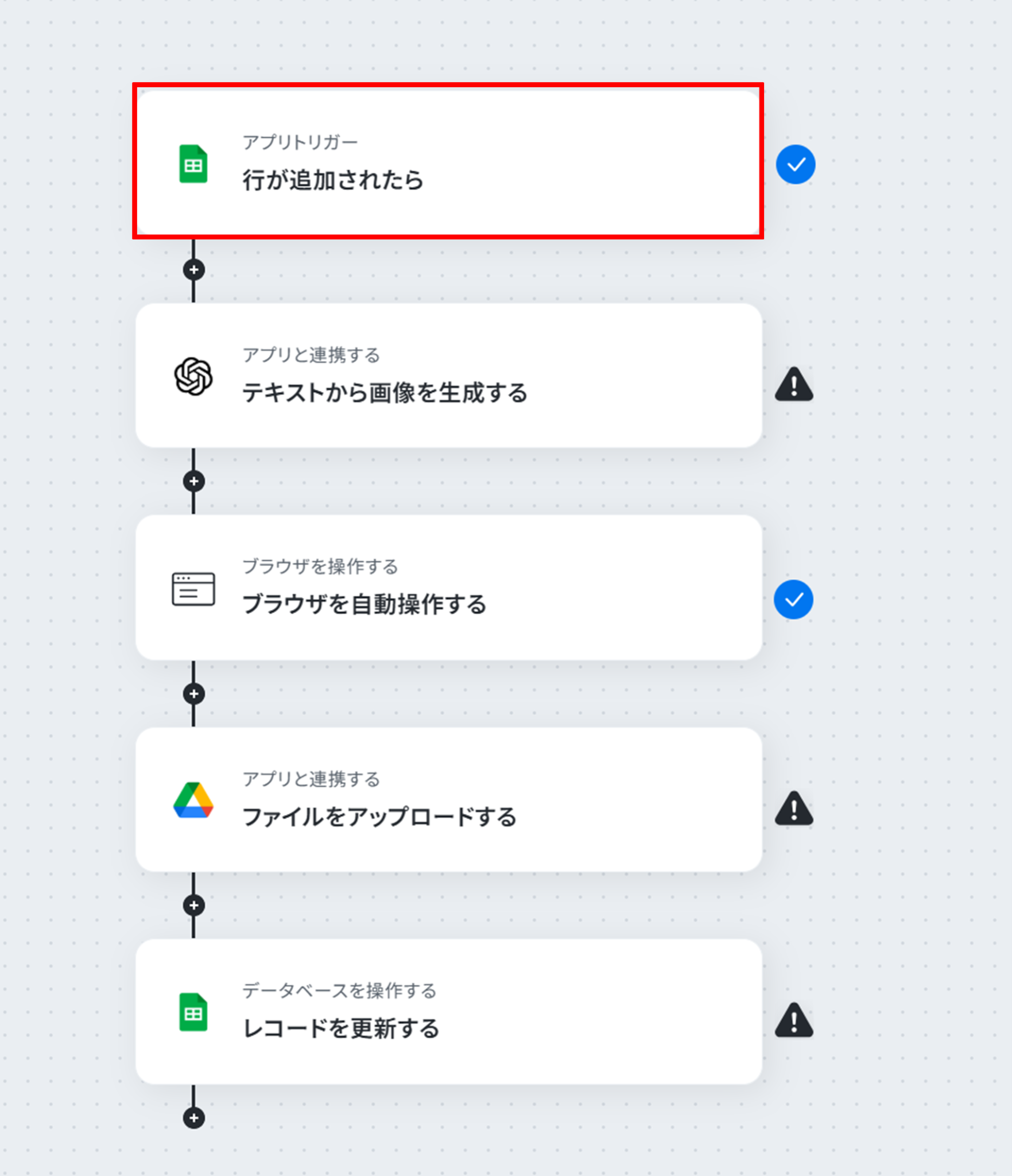 それではここから代表的な例として、Googleスプレッドシートに行が追加されたら、その情報を基に画像を自動で生成し、Google Driveの指定フォルダに自動で保存するフローを解説していきます!