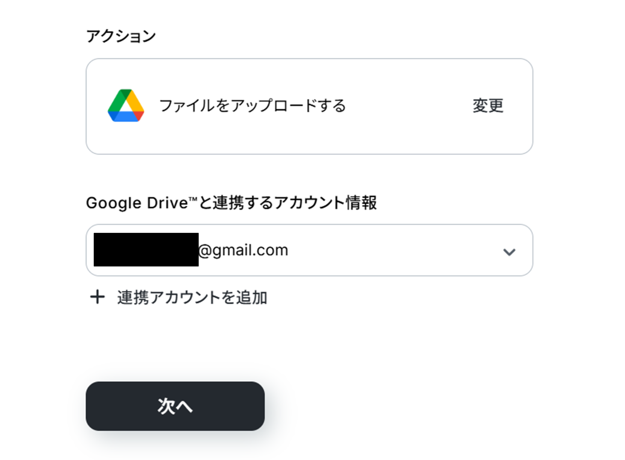 (2)「連携アカウントとアクションを選択」画面から、Google Driveと連携するアカウント情報に誤りがないかを確認し、アクションは「ファイルをアップロードする」のままで「次へ」をクリックしましょう。