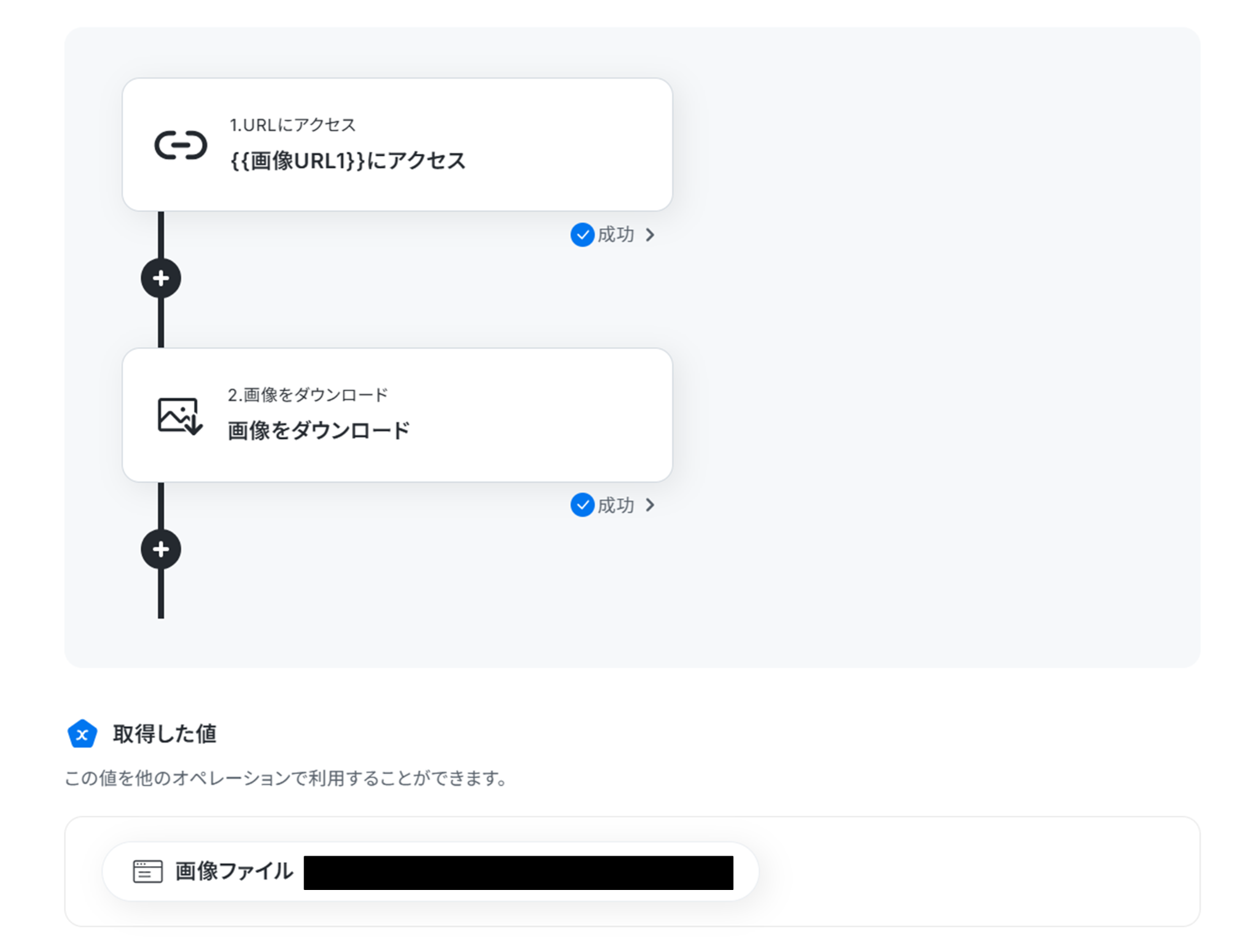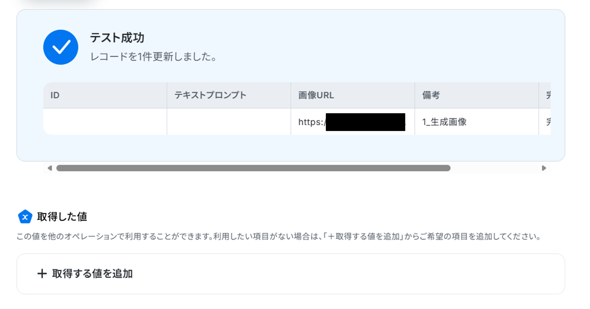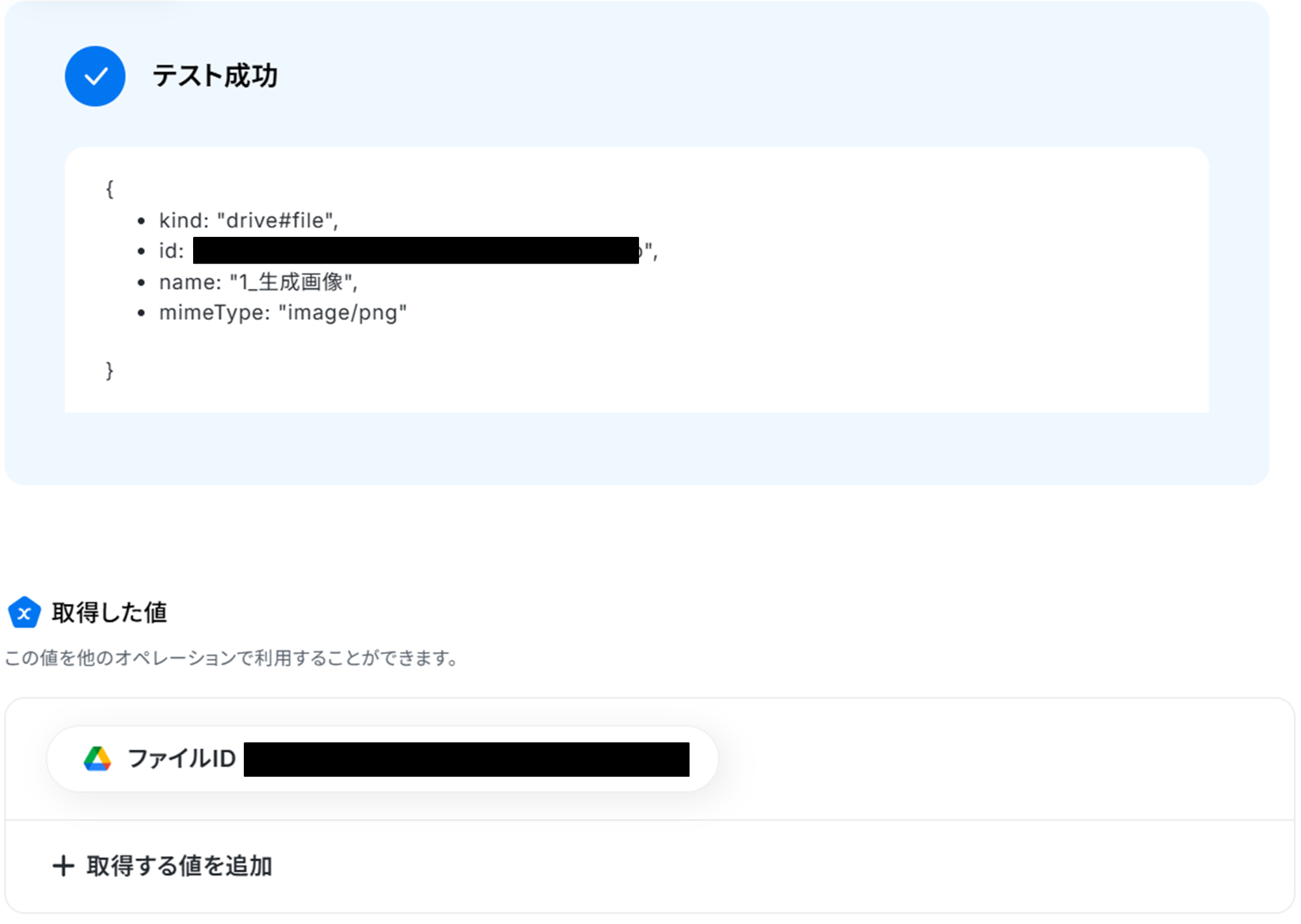 テストに成功すると、取得した値に「画像ファイル」が追加されます。