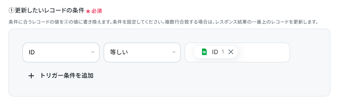 (3)「更新したいレコードの条件」をプルダウンと「取得した値」を使って入力します。